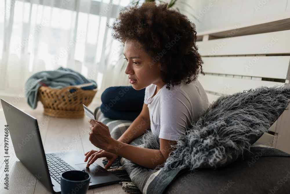 Beautiful African-American young Woman purchasing online with a credit card using a laptop computer at home