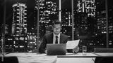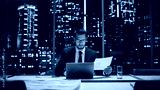 Successful Handsome Businessman Working on Laptop Computer in Big City Office Late in the Evening. Finance Investment Analyst Checking Line and Pie Graphs from Project Management Report.