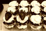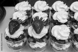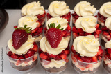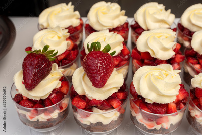 Pastry chef preparing step by step delicious dessert black forest or chip with chocolate biscuit, cream and fresh strawberries in shot glasses
