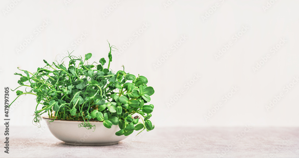 Micro greens superfood. Green peas and sunflower sprouts close up in a bowl. Germination sprouting and healthy eating and living. Gardening at home kitchen concept. Microgreens food. Copy space