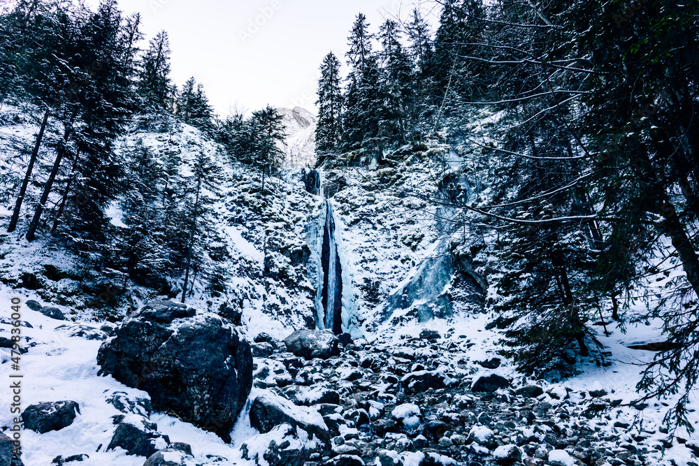 Waterfall Siklawica at winter time.Tatra Mountains in Poland, near Zakopane, Europe.