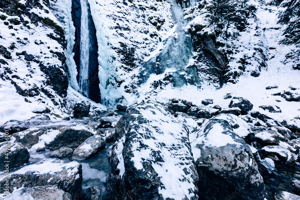 Waterfall Siklawica at winter time.Tatra Mountains in Poland, near Zakopane, Europe.