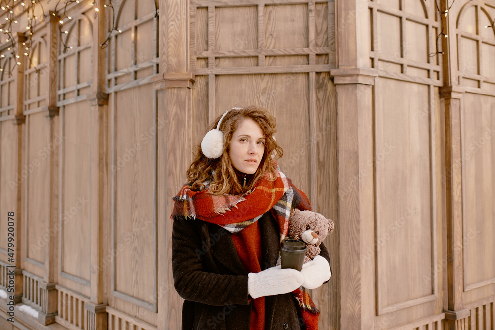 Young woman in winter clothes and fur earmuffs. Girl with teddy bear and mulled wine