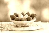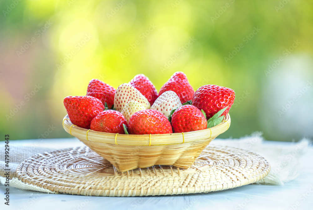 Fresh red and white strawberries in a wooden basket on blur background, Red Strawberry and Pine berry or Hula strawberry in Bamboo basket.