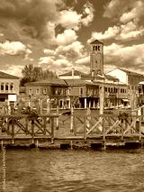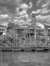 Murano island, Venice, Veneto, Italy. View at bell tower brick building of Church of Santa Maria e San Donato. Wooden dock on the water and scenic sky with summer clouds.