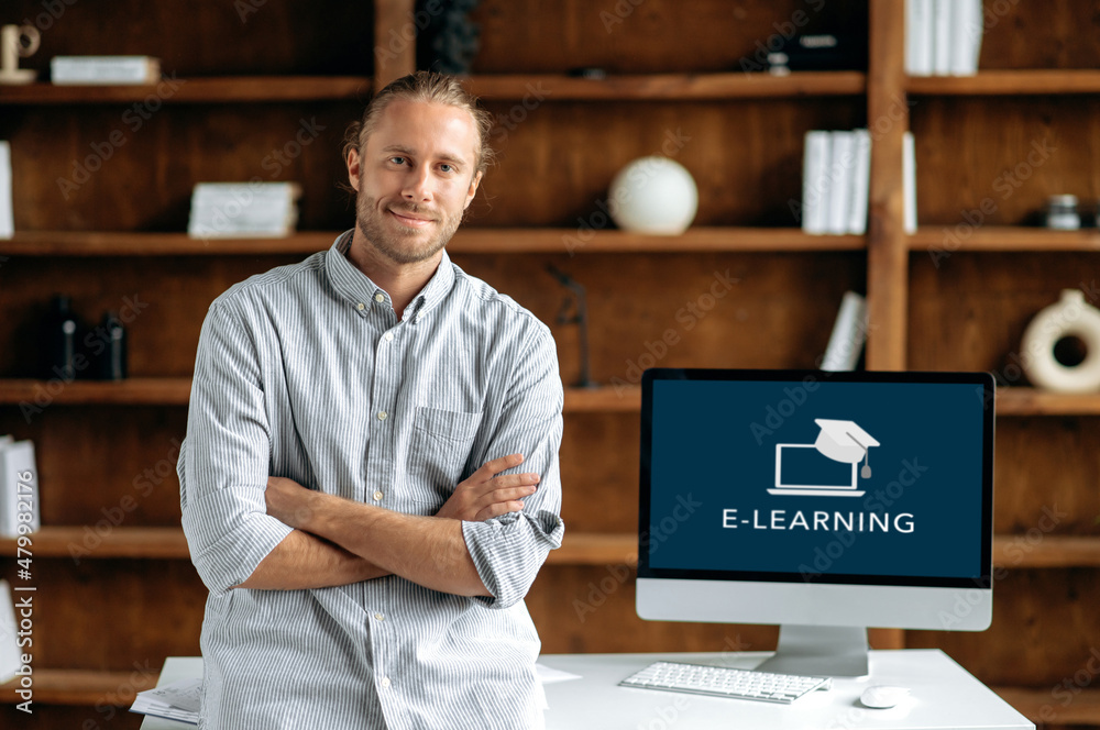 Distance learning concept, distance teaching. Young smart american man, teacher or university student, stands in the library near the table with crossed arms, the inscription e-learning on the screen