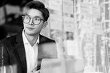 creative agency smart glasses asian male formal cloth conversation with smartphone freelance working with laptop at coworking area office space with freshness with blur office background