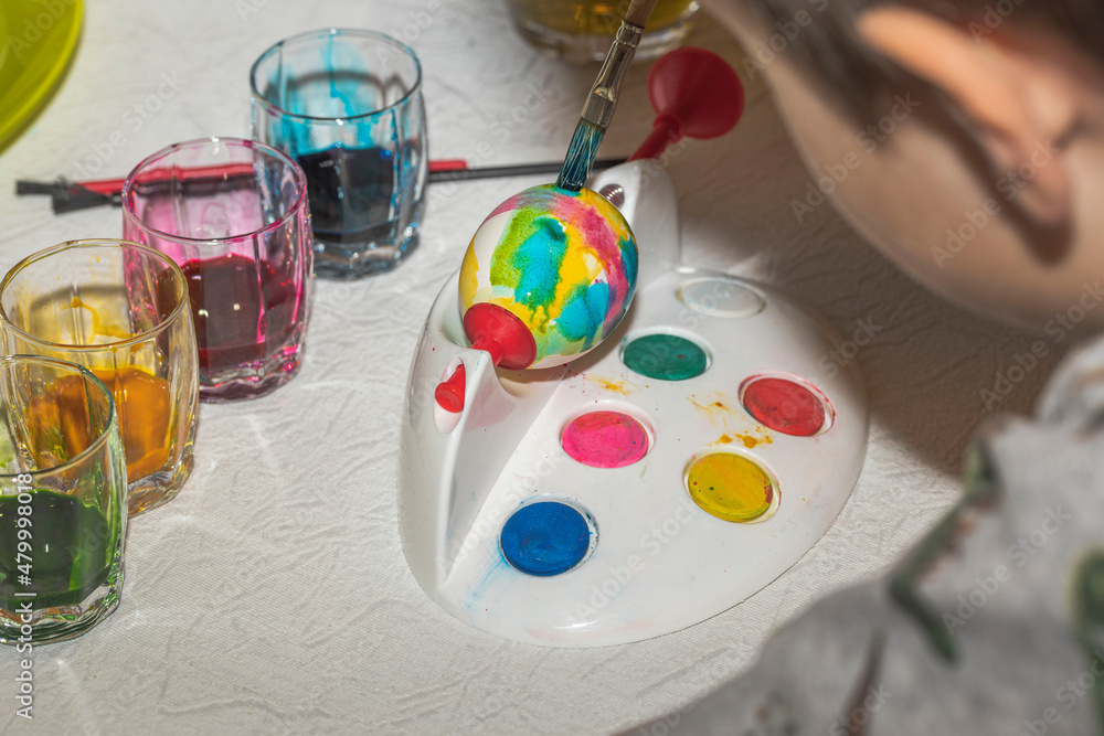 View of a boy learning to paint Easter eggs with special utensils. Holiday concept. Sweden.