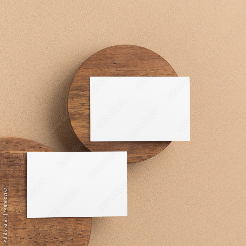 Two Business cards on a wooden round plate on a beige background - top view, closeup. Minimal mock up.