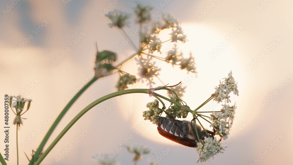 Melolonthinae Beetle Melolonthini On Anthriscus sylvestris at summer sunset. Cow parsley, wild chervil, wild beaked parsley, Queen Anne's lace or keck, is a herbaceous biennial or short-lived