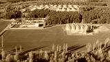 Aerial View Modern Granary, Grain-drying Complex, Commercial Grain Or Seed Silos In Rural Landscape. Corn Dryer, Inland Grain Terminal, Grain Elevators In Field 4K. Biogas Plant Or Bioreactor For