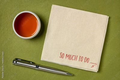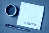 so much to do note, handwriting on a napkin with a cup of tea, feeling overwhelmed or overworked or too many options