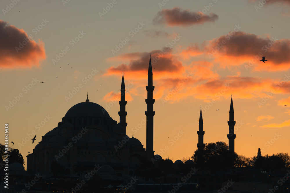 Istanbul mosques. Silhouette of Suleymaniye Mosque at sunset.