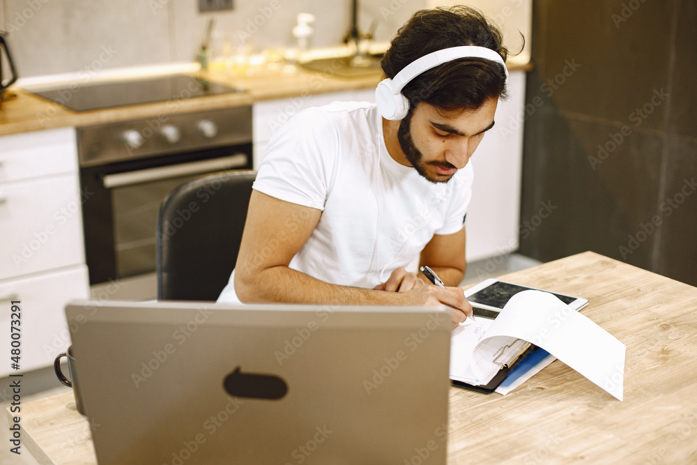Online education. Young arabic man study with a laptop at home and taking notes.