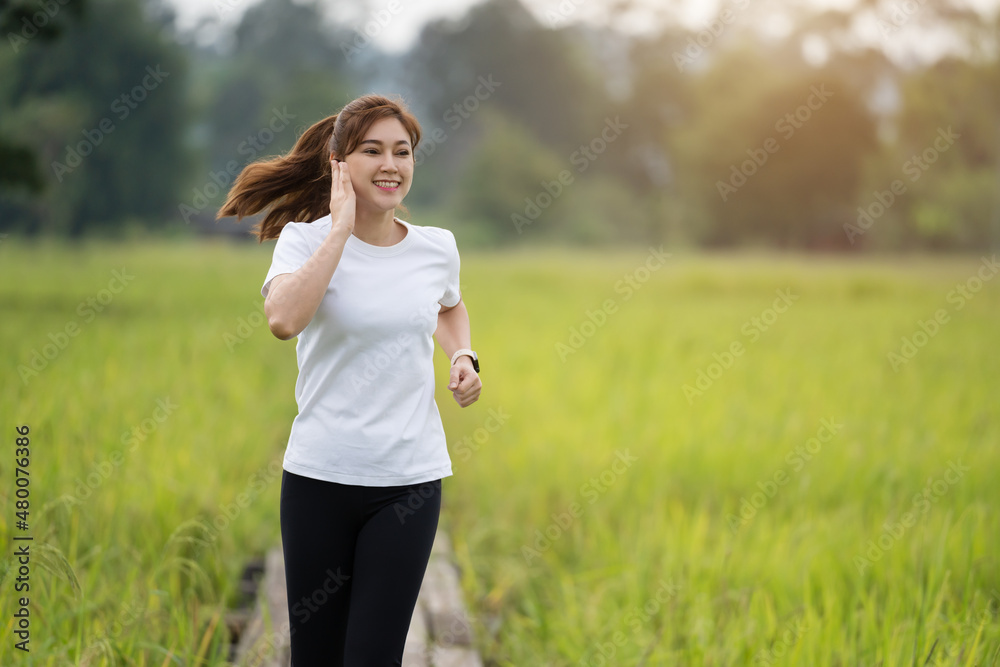 woman listening music on earphones while running on wooden path in field