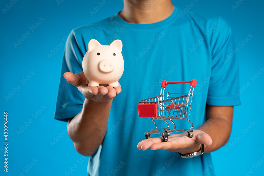 hands holding piggy bank and shopping chart choosing between saving or spending