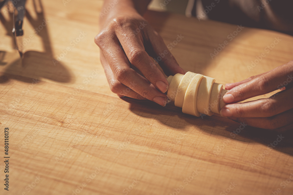 Young pastry chef making some croissant in the bakery.food concept and bakery background.
