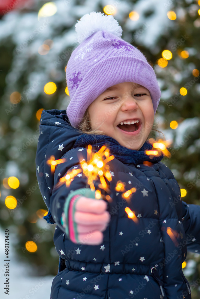A happy little girl holds a burning sparkler in her hand against the background of a Christmas tree, close-up, selective focus. Concept: festive mood, Christmas and New Year, children's joy.