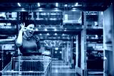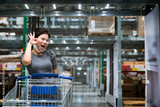 safety shopping,asian female wearing face mask protecion hand gesture make ok alright signal for express of confident emotion while pull shopping cart checking choose items in warehouse shelf shopping