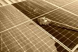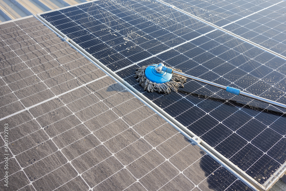 Man using a mop and water to clean the solar panels that are dirty with dust and birds' droppings to improve the efficiency of solar energy storage.