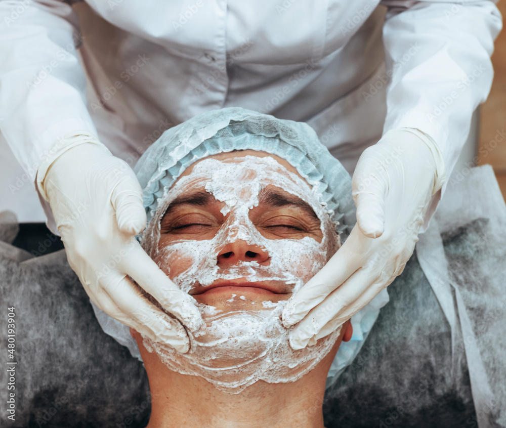 Beautician applying scrub mask on face to young man, spa beauty salon. The concept of body and face care for men
