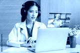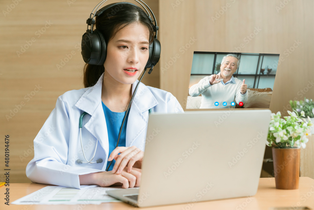 Professional attractive Asian female doctor diagnosis talking to old senior patient in video conference ,Positive doctor waving and having online doctor examine consultation on digital tablet laptop