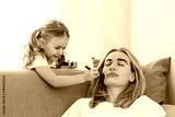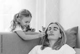 Happy loving family. Young mother sleeping on sofa at home while child girl paint face colored watercolors.Funny make up.having fun.Prank