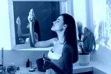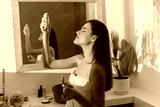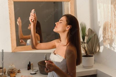 A beautiful young woman, wrapped in a towel, sprays mineral water on her face in front of a mirror. Skin hydration concept.