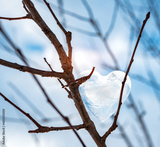 icy heart branches against background spring sky rays. concept love, romance