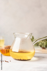 Buckwheat tea and granules with honey, light grey background. Healthy buckwheat tea, Ku Qiao seeds. Healthy food.