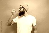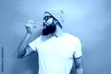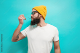 Portrait of handsome man with beard wearing glasses enjoying delicious meal with fork in studio with place for text