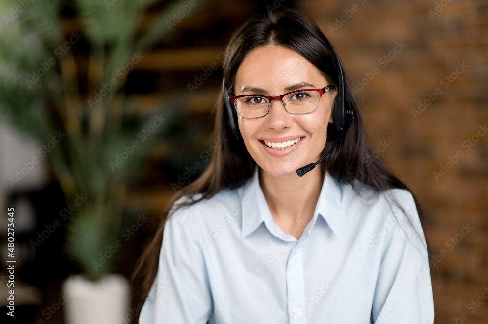 Close-up headshot of happy young brunette caucasian woman wearing headphones and glasses, freelancer, call center operator, consultant, wearing formal stylish shirt, looking at the camera, smiling