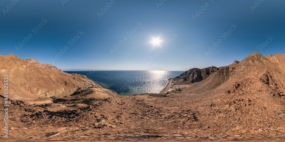 360 hdr panorama view from the height of the mountains range to the blue sea in seamless spherical equirectangular projection