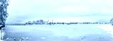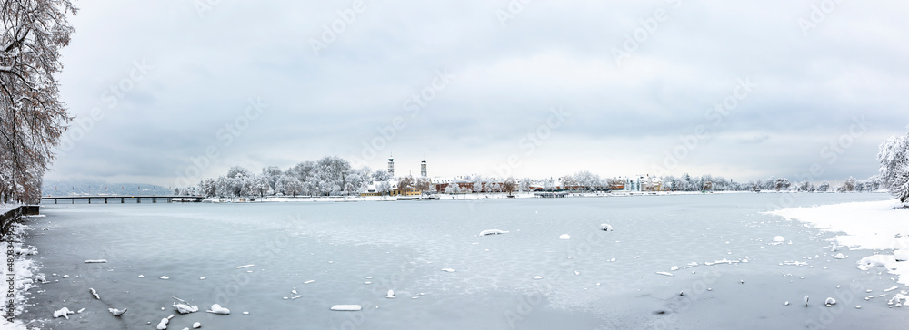 Ansicht von Lindau Bodensee im winter mit zugefrorenem Kleinen See