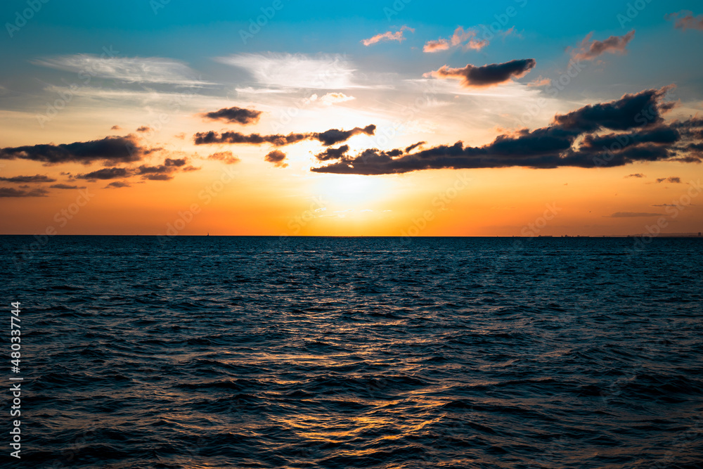 Sunset over the sea. Sunset background photo with silhouette of clouds