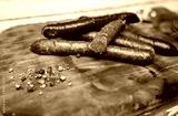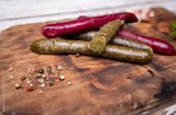 A close -up of roasted vegan sausages on a vintage wooden cutting board, selective focus. Meat free products.