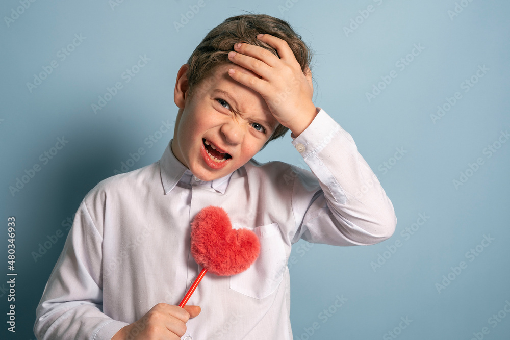 The boy holds his head and shouts something irritably. The boy is unhappy.