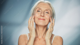 Portrait of Beautiful Senior Woman Gently Applying Face Cream. Elderly Lady Makes Her Skin Soft, Smooth, Wrinkle Free with Natural anti-aging Cosmetics. Product for Beauty Skincare, Makeup