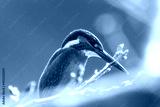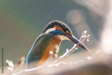 Close up image of Male common Kingfisher (Alcedo atthis) perching on a tree branch.