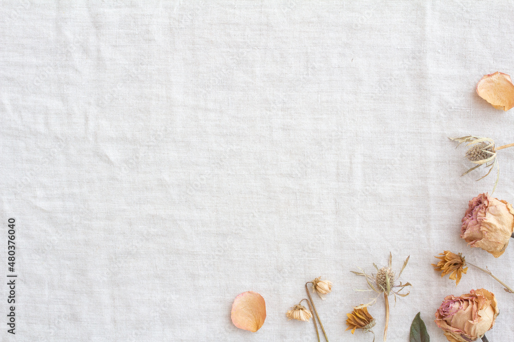 バラのドライフラワーのL字装飾フレームとグレーの麻布背景