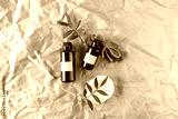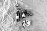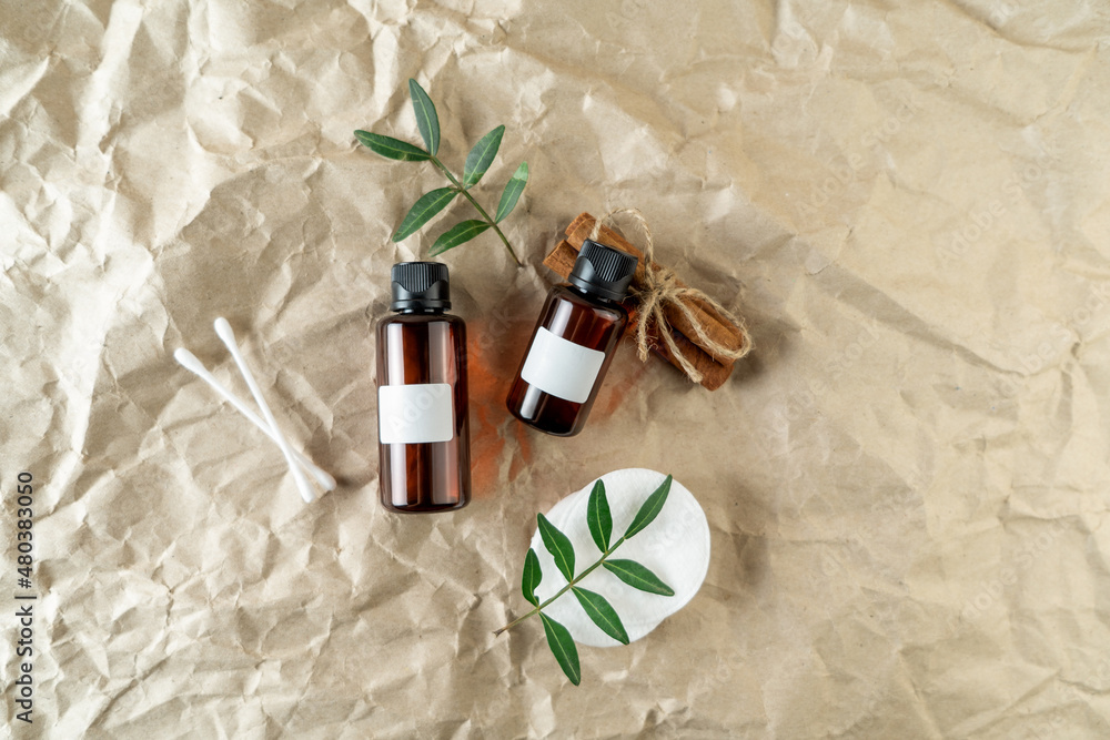A face serum or essential oil with blank labels on them lying on a beige craft paper background