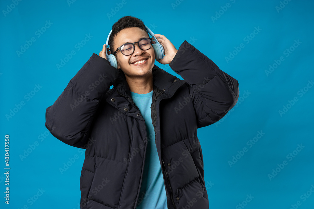 Happy young man with headphones. Listening music