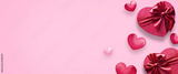 Valentine's day decorations with heart shaped gift boxes and small hearts on pink background. Top view.