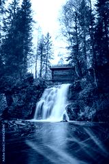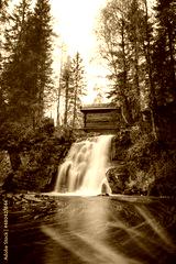 View of the beautiful Komulanköngäs waterfall, located in the northern part of Kainuu, Finland. View through the colourful autumn leaves of the long stretching white hair falling into the lake