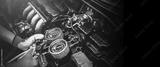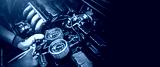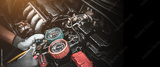 Close up hand of auto mechanic using measuring manifold gauge check the refrigerant and filling car air conditioner for fix and checking for repair service support maintenance and car insurance.