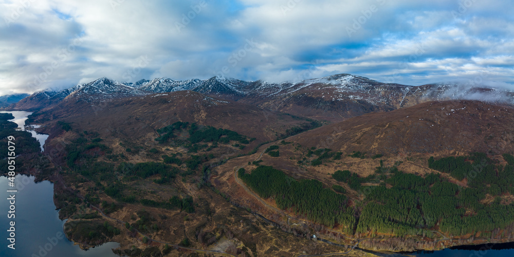Aerial view of Glen Affric in the highlands of Scotland near Inverness and Canich showing the flat calm lochs amongst Munro mountains