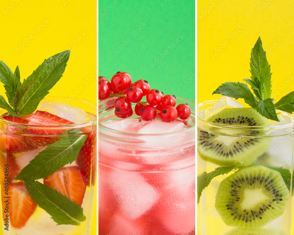Collage of summer drink. Lemonade with strawberry, kiwi and red currant in the drinking glasses on the colored background. Close-up.