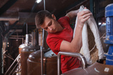 Young male brewer pouring barley into metal container, manufacturing craft beer