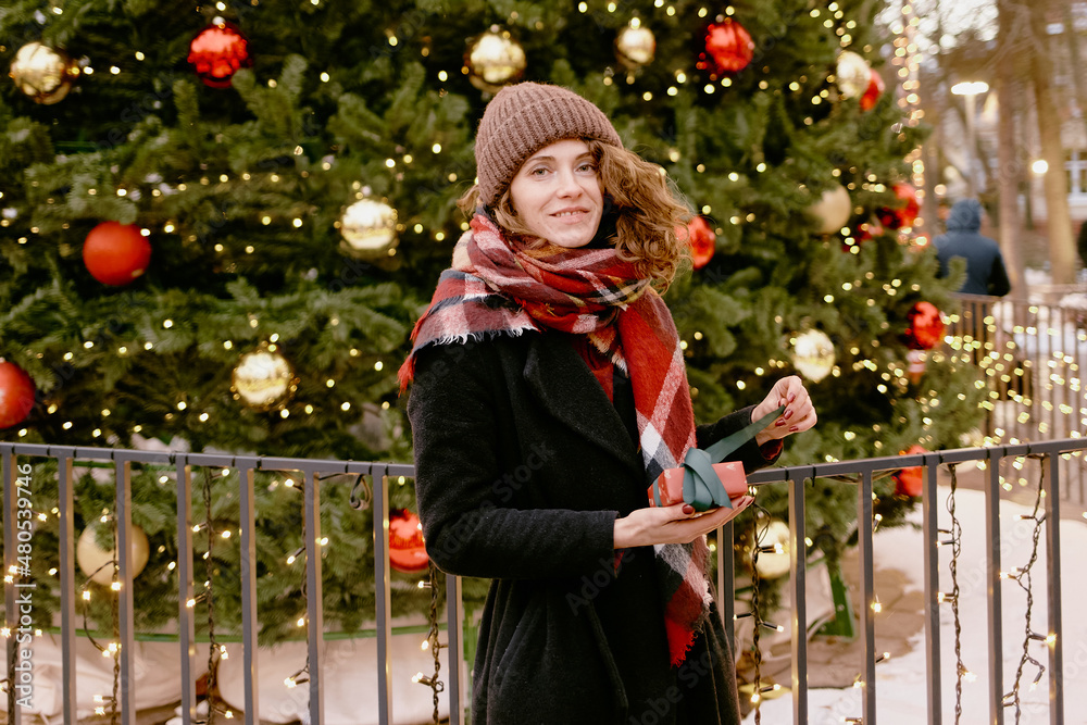 Woman in winter clothes and scarf at the Christmas market. Girl outdoors