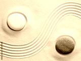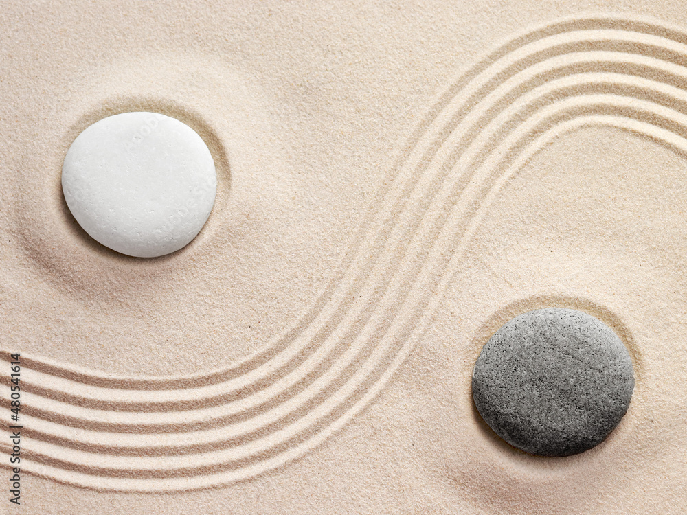The yin and yang symbol. Balance. Good and evil. Stone garden for meditation. Japanese Zen concept. Buddhism and mindfulness. Concentration and concentration. Round stones on a sandy background. Philo